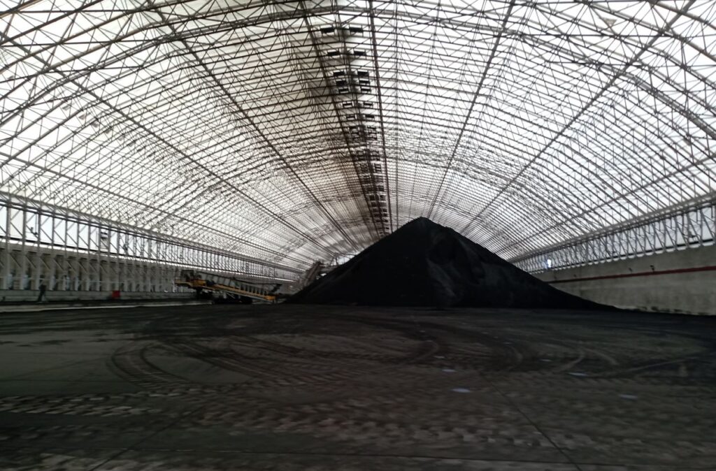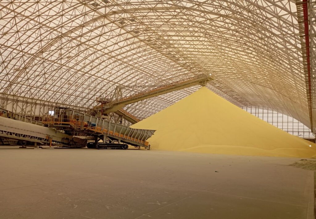 Bedeschi is nearing completion of a pet coke and sulphur handling project. The system will include two parallel lines (one for sulfur and one for pet coke), each comprehensive of: truck unloading onto surface feeders, stackers, mobile hoppers for product reclaiming, a complete conveyor system from storage areas to the wharf, where a single loading system for both materials with mobile link conveyors leads to a radial shuttle-type shiploader. The stacking capacity for both pet coke and sulphur is 1,500 t/h.