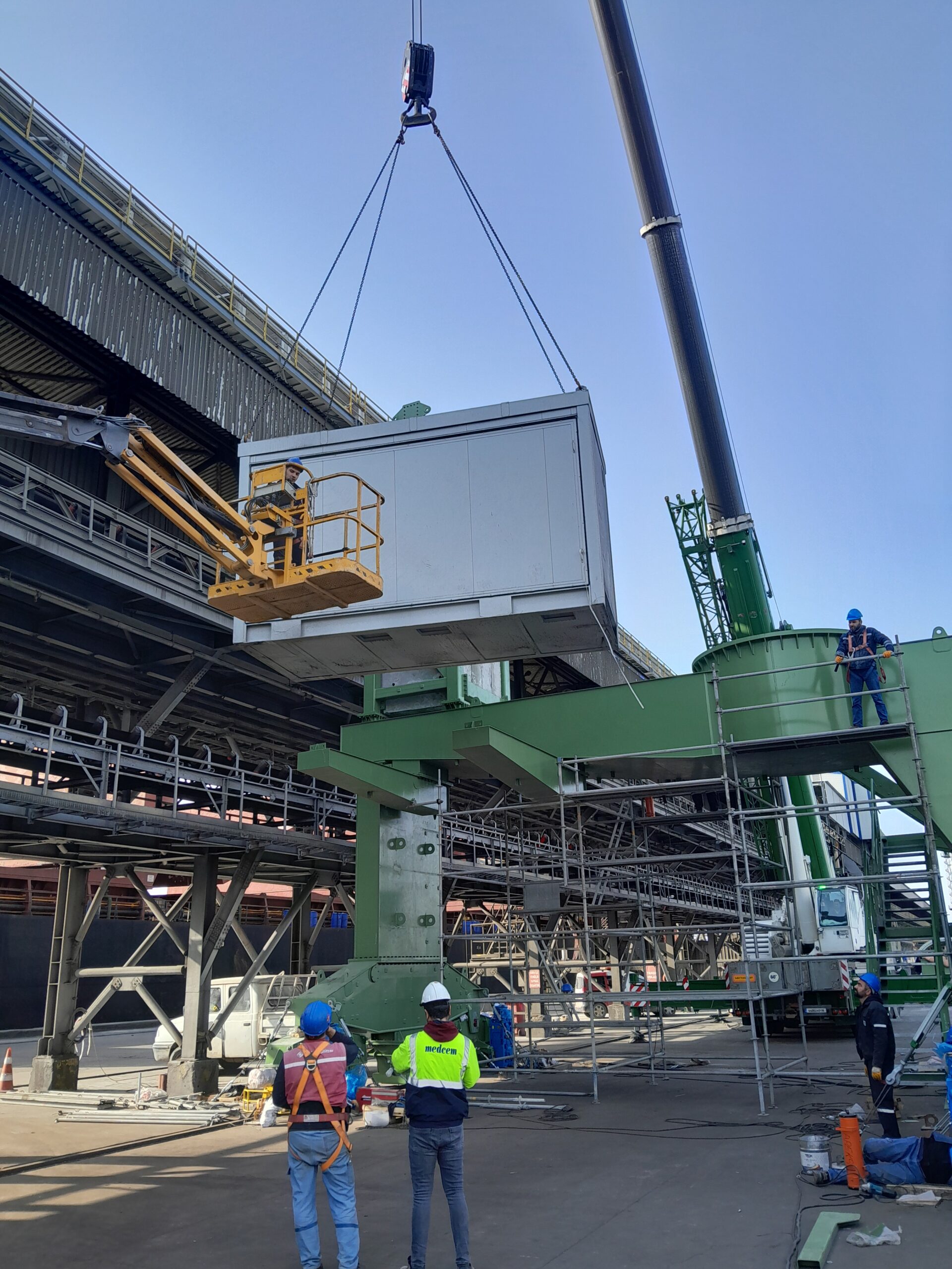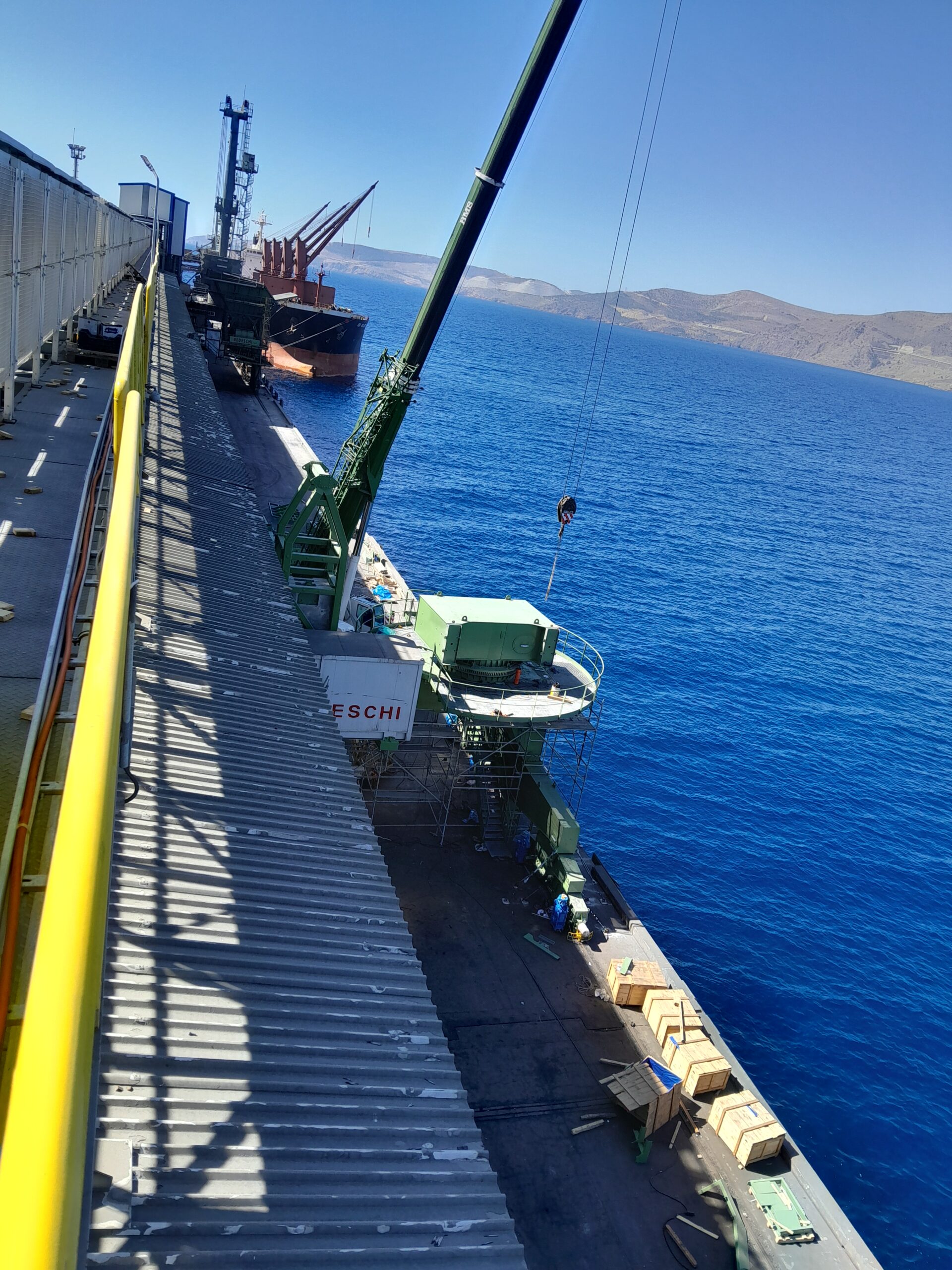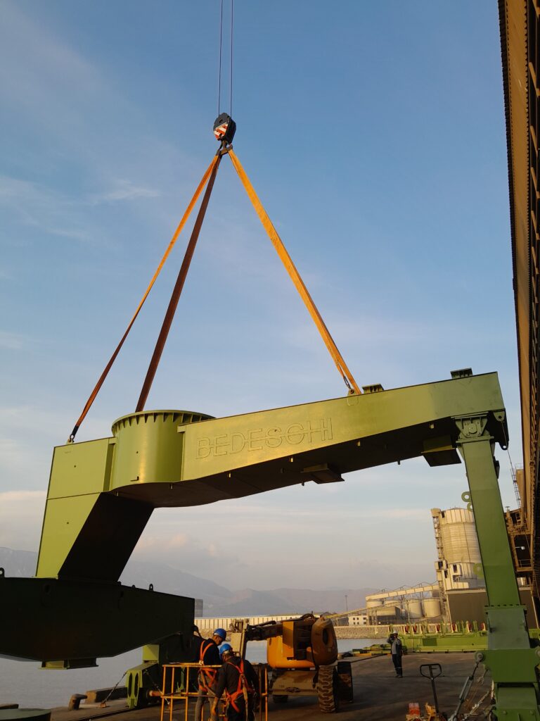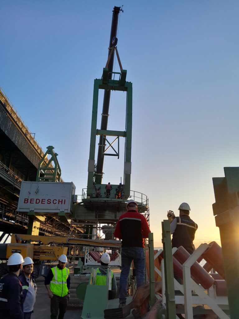 Site update of the Bedeschi shiploader, currently under construction at the client’s dock. This shiploader has a capacity of 1,350 tons per hour and is part of the new expansion project at the Yesilovacik Terminal. The company has also recently supplied two conveyor lines—one for clinker and one for cement—consisting of four pipe conveyors.