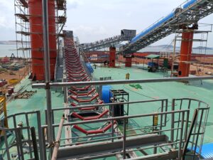 The project includes two receiving hoppers with belt feeder extractors, a coal blending mixer, belt conveyors, and a slewing-luffing telescopic shiploader.